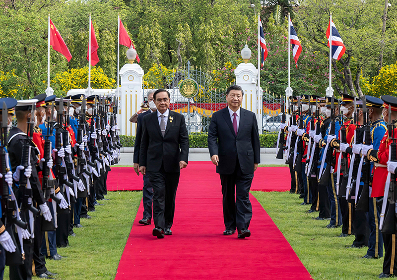 当地时间11月19日中午,国家主席习近平在曼谷总理府同泰国总理巴育举行会谈。新华社记者 翟健岚 摄 习近平指出,双方要像走亲戚一样常来往、多走动,在涉及彼此核心利益和重大关切问题上继续相互坚定支持。双方要落实好未来5年《中泰战略性合作共同行动计划》,统筹推动各领域合作取得更多成果。要有效对接各自发展战略,推动高质量共建“一带一路”不断取得新成效。双方要加强投资、贸易、旅游、基础设施、产业园等传统领域合作,同时不断培育新增长点,推动数字经济、新能源汽车、科技创新等新领域合作取得积极进展。要加快中老泰三方铁路合作,积极推进“中老泰联通发展构想”,重点加强基础设施“硬联通”,做好物流通关“软联通”,扩大泰国优质农副产品输华。中方愿同包括泰国在内的各方一道,高质量实施《区域全面经济伙伴关系协定》,让这一全球最大自贸区安排释放更大红利。加大打击跨境犯罪,深化追逃追赃合作。加强教育、医疗、扶贫等民生领域合作,通过多种方式交流减贫发展经验,推动两国扶贫合作走深走实,办成、办好一批贴近群众、服务基层的实事。要加强青年交流,使两国人民心更近、情更深,丰富中泰命运共同体的人文内涵。 习近平指出,中方愿同泰方加强国际事务协作,为共同促进世界持久和平与长远发展作出积极努力。中方愿同泰国等东盟国家加强团结合作,聚焦“五大家园”建设,不断释放中国东盟全面战略伙伴关系新动能。泰国即将接任澜湄合作共同主席国,中国愿同湄公河国家共同推动次区域合作高质量发展。